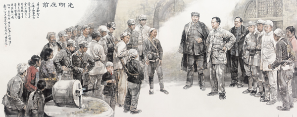 作品简介:为了贯彻瓦窑堡会议确定的建立抗日民族统一战线的精神,1936年春,中共中央派刘少奇来到天津,主持北方局工作。在刘少奇的领导下,华北地区的抗日民族统一战线逐步形成,党的组织和党员队伍也得到恢复和发展。抗日战争爆发后,北方局坚决执行党中央的路线、方针和政策,广泛发动和武装群众,开辟敌后战场,建立抗日根据地,使华北沦陷区成为中国共产党领导的主战场之一,在党的历史和抗日战争史上留下了光辉的一页。此幅作品描绘的是刘少奇同志正在北方局发动和武装群众时的场面,他极具亲和力,和大家谈笑风生,不同身份、行业的党员和爱国人士在认真聆听他的宣讲。