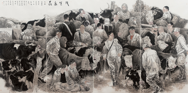 作品简介:《牛运康庄》是决战决胜脱贫攻坚,全面建设小康社会为主题创作的。此幅作品体现了2020年全国疫情得以控制内蒙古通辽市开鲁县的牛羊交易市场的牛羊进行交易情景。实现如期脱贫,精准脱贫发展经济,致富增收的重要途径。广大农牧民在牛羊交易市场进行交易。使“扶贫牛”变成“致富牛”。最终目标是打赢精准脱贫攻坚战,全面建设小康社会。
