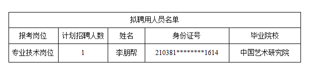 根据《中共中央组织部 人力资源社会保障部关于进一步做好事业单位公开招聘工作的通知》(人社部发〔2024〕57号)和《市委组织部市人力社保局关于进一步完善事业单位公开招聘工作人员的通知》(津人社局发〔2017〕37号)等文件精神,天津画院2025年公开招聘经资格初审、资格复审、专业技术考试、面试、体检、考察等程序,经党组会研究,现将拟聘用人员情况予以公示,拟聘用人员基本情况如下:
